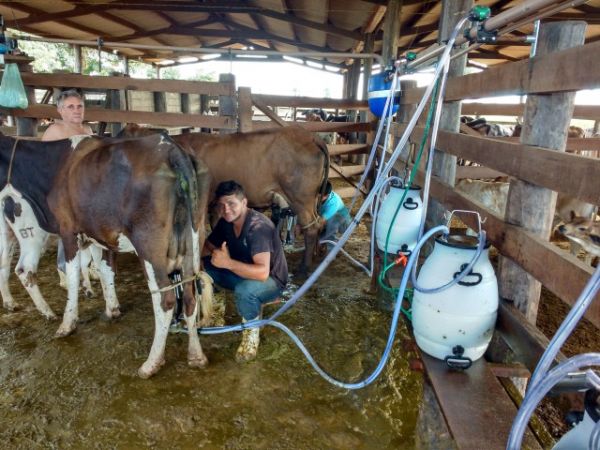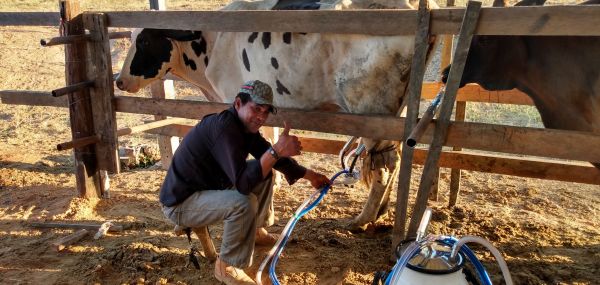 Sr. Silmar. Tirando leite na estrada. Ordenha móvel. Praticidade e baixo custos.